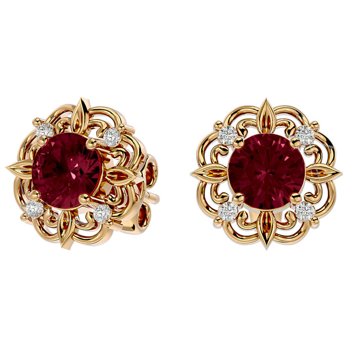 These elegant gemstone earrings feature two 6mm garnet gemstones at approximately 2 carats. They are surrounded by 8 sparkling diamonds in I-J color, I1-I2 clarity at 1/10 carat total weight. Total gem weight is approximately 2 1/10 carats. These earrings are in 14 karat yellow gold and have comfortable and secure friction backs.