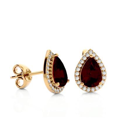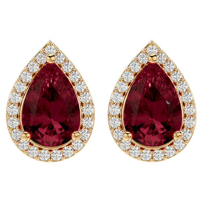 These elegant gemstone earrings feature two 9x6mm pear shape garnet gemstones at approximately 2.10 carats. They are surrounded by 48 sparkling diamonds in I-J color, I1-I2 clarity at 1/4 carat total weight. Total gem weight is approximately 2 1/3 carats. These earrings are in 14 karat yellow gold and have comfortable and secure friction backs.