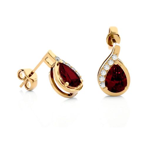 These elegant gemstone earrings feature two 7x5mm pear shape garnet gemstones at approximately 1 3/4 carats. They are surrounded by 12 sparkling diamonds in I-J color, I1-I2 clarity at 1/10 carat total weight. Total gem weight is approximately 2 carats. These earrings are in 14 karat yellow gold and have comfortable and secure friction backs.