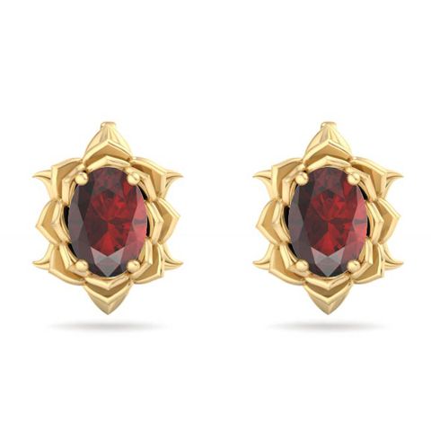 2 Carat Oval Shape Garnet Ornate Stud Earrings In 14K Yellow Gold