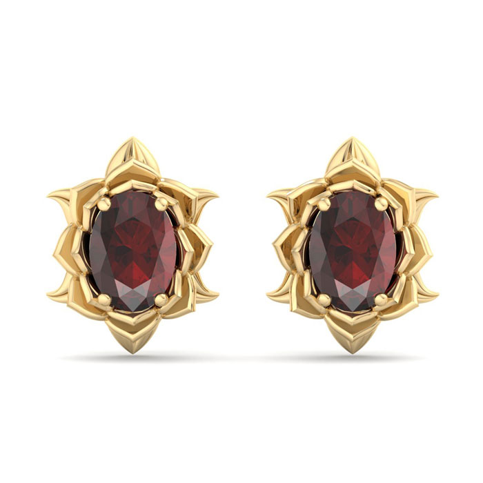 2 Carat Oval Shape Garnet Ornate Stud Earrings In 14K Yellow Gold