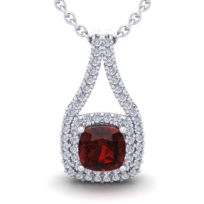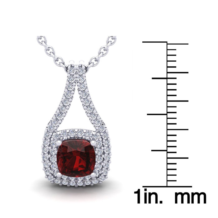 1 1/2 Carat Cushion Cut Garnet and Double Halo Diamond Necklace In 14 Karat White Gold, 18 Inches