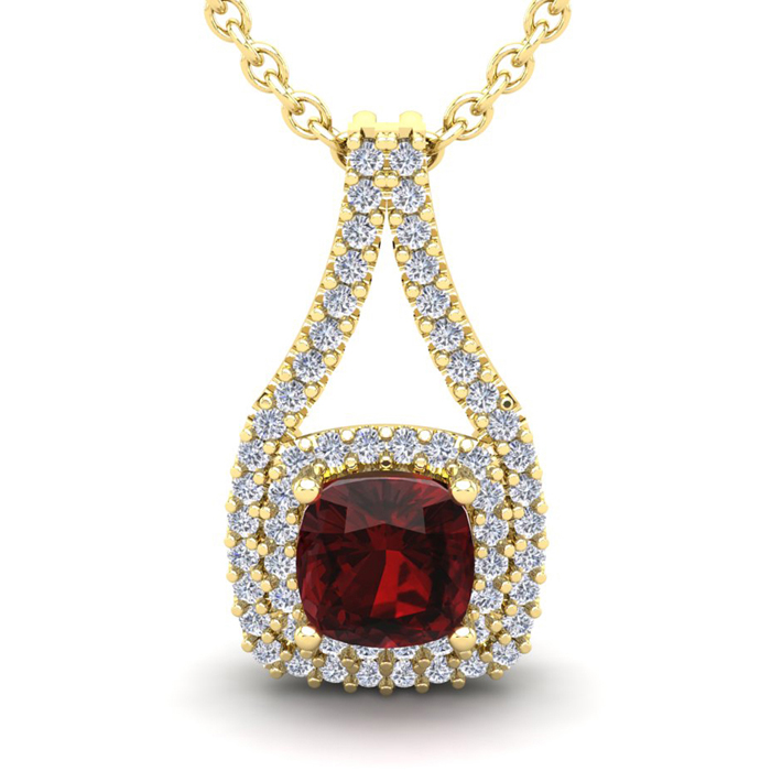 This stunning gemstone and halo diamond necklace features one 6x6mm cushion cut garnet gemstone at 1.10 carats. It is surrounded by 62 sparkling diamonds in a halo in I-J color, SI2-I1 clarity at 0.31 carats. Total gem weight is 1.41 carats. This necklace is crafted in 14 karat yellow gold and comes with an 18 inch cable chain with spring-ring clasp.