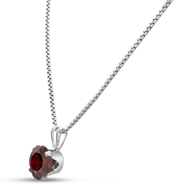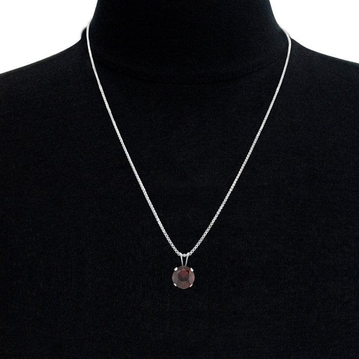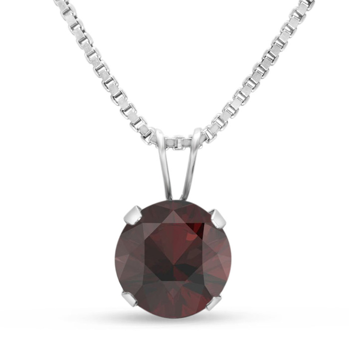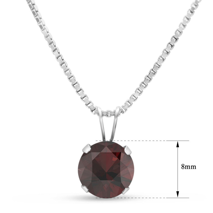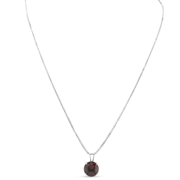 This classic gemstone necklace features one, 8mm garnet gemstone. Total carat weight is 1 1/2 carats. This necklace is in sterling silver with an 18 inch box chain with a spring-ring clasp.