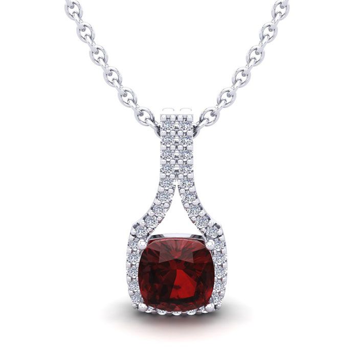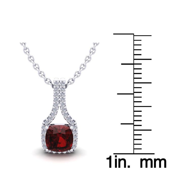 1 1/3 Carat Cushion Cut Garnet and Classic Halo Diamond Necklace In 14 Karat White Gold, 18 Inches
