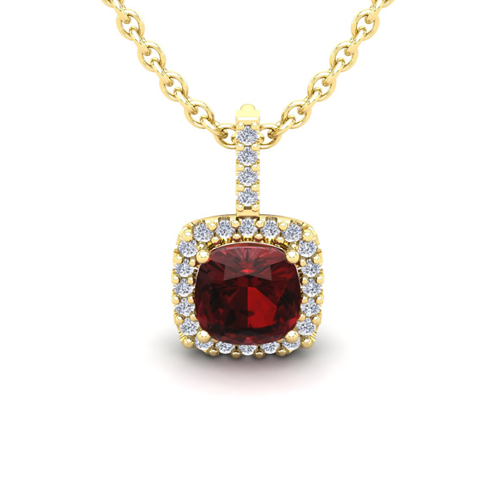 1 1/4 Carat Cushion Cut Garnet and Halo Diamond Necklace In 14 Karat Yellow Gold, 18 Inches