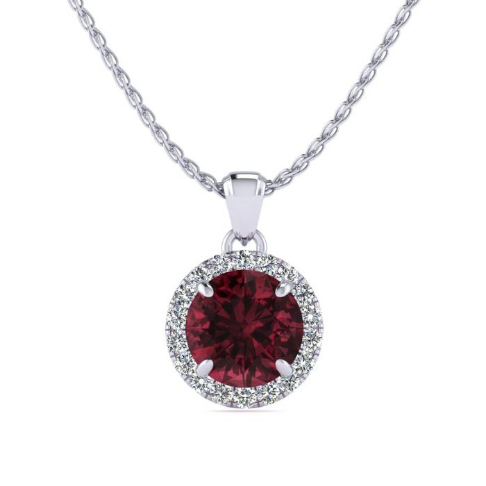 1 1/4 Carat Round Shape Garnet and Halo Diamond Necklace In 14 Karat White Gold