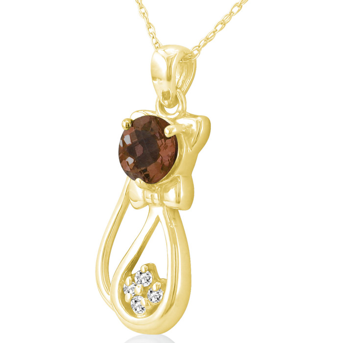 This garnet necklace features a 1 carat round garnet gemstone in an adorable cat pendant. There are 4 sparkling diamonds in J-K color, I1-I2 clarity at 0.06 carats. Total carat weight is 1.06 carats. This necklace is in 10 karat yellow gold and comes with an 18 inch cable chain with a spring-ring clasp.
