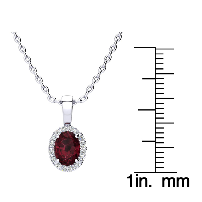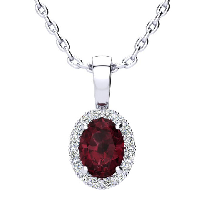 1 Carat Oval Shape Garnet and Halo Diamond Necklace In 14 Karat White Gold With 18 Inch Chain