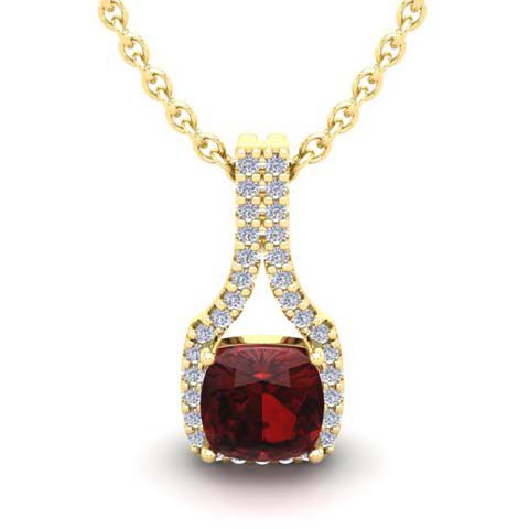 This stunning gemstone and halo diamond necklace features one 7x7mm cushion cut garnet gemstone at 1.58 carats. It is surrounded by 33 sparkling diamonds in a halo in I-J color, SI2-I1 clarity at 0.33 carats. Total gem weight is 1.91 carats. This necklace is crafted in 14 karat yellow gold and comes with an 18 inch cable chain with spring-ring clasp.