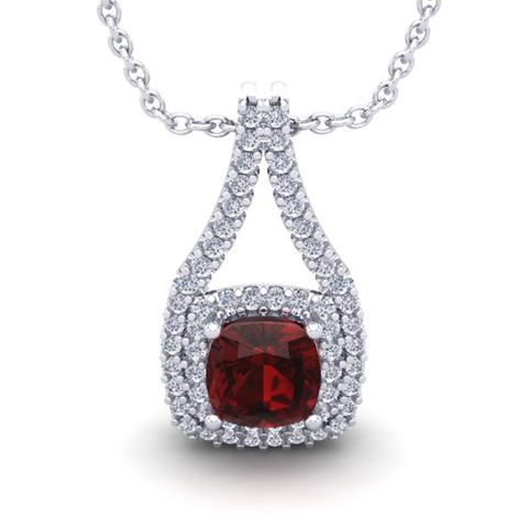 This stunning gemstone and halo diamond necklace features one 7x7mm cushion cut garnet gemstone at 1.58 carats. It is surrounded by 58 sparkling diamonds in a halo in I-J color, SI2-I1 clarity at 0.58 carats. Total gem weight is 2.16 carats. This necklace is crafted in 14 karat white gold and comes with an 18 inch cable chain with spring-ring clasp.