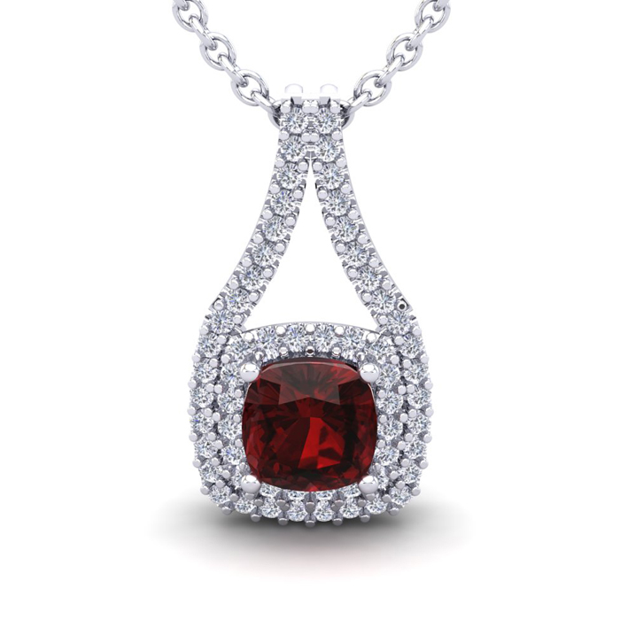 2 Carat Cushion Cut Garnet and Double Halo Diamond Necklace In 14 Karat White Gold, 18 Inches