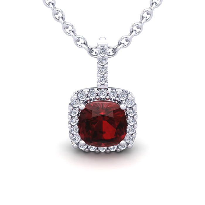 3 1/2 Carat Cushion Cut Garnet and Halo Diamond Necklace In 14 Karat White Gold, 18 Inches