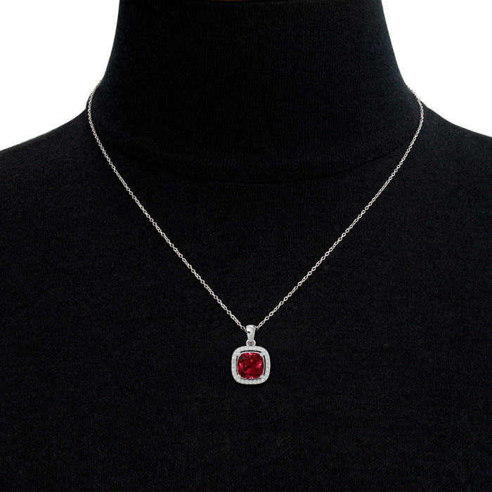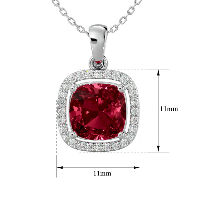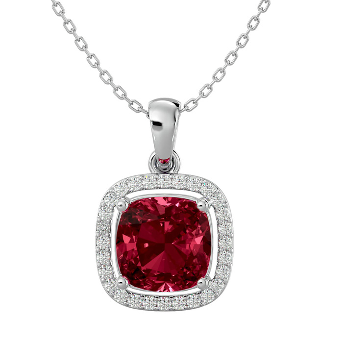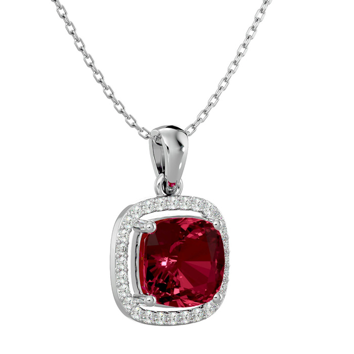 3 1/2 Carat Cushion Cut Garnet and Halo Diamond Necklace In 14 Karat White Gold, 18 Inches
