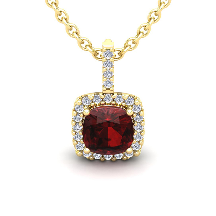 3 1/2 Carat Cushion Cut Garnet and Halo Diamond Necklace In 14 Karat Yellow Gold, 18 Inches