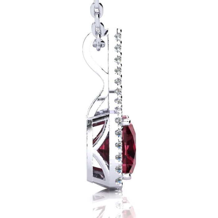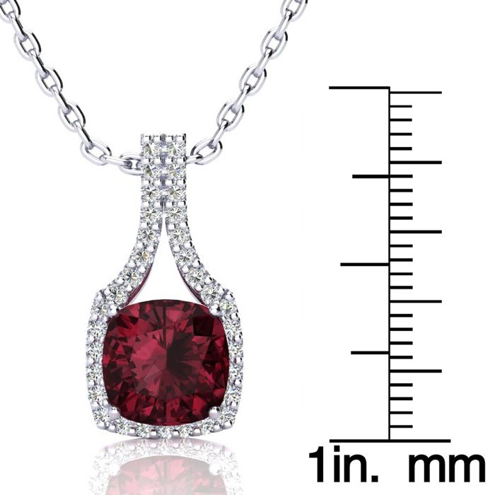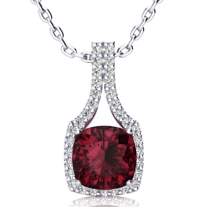 3 2/3 Carat Cushion Cut Garnet and Classic Halo Diamond Necklace In 14 Karat White Gold, 18 Inches