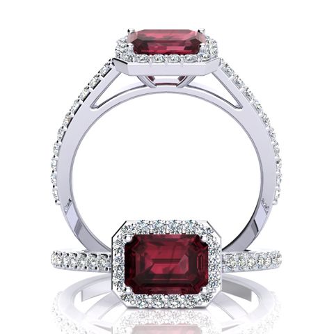 This stunning gemstone and halo diamond ring features one 7x5mm emerald shape garnet gemstone at 1.30 carats. It is surrounded by 42 sparkling diamonds in a halo and down the band in H-I color, I1-I2 clarity at 0.31 carats. Total gem weight is 1.61 carats. This ring is crafted in 14 karat white gold.