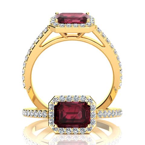 This stunning gemstone and halo diamond ring features one 7x5mm emerald shape garnet gemstone at 1.30 carats. It is surrounded by 42 sparkling diamonds in a halo and down the band in H-I color, I1-I2 clarity at 0.31 carats. Total gem weight is 1.61 carats. This ring is crafted in 14 karat yellow gold.