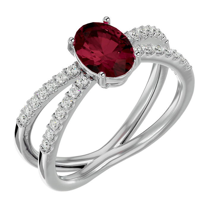 This garnet ring features one 8x6mm oval shape garnet gemstone. It is surrounded by 28 sparkling diamonds totaling 1/4 carat in I-J color, I1-I2 clarity. Total carat weight is approximately 1 1/2 carats. This ring is in sterling silver.