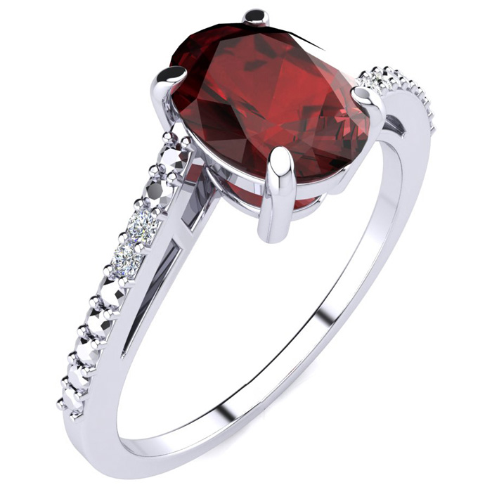 This classic gemstone ring features one 8x6mm oval shape garnet gemstone at approximately 1.50 carats. It is surrounded by 2 sparkling diamonds in I-J color, I1-I2 clarity at 0.01 carats. Total gem weight is approximately 1.51 carats. This ring is in 10 karat white gold.