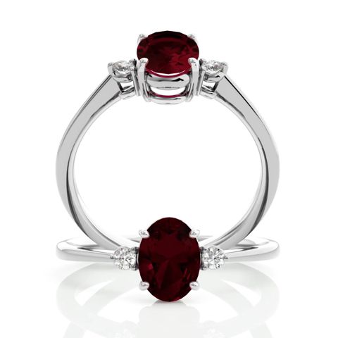 This garnet ring features one 8x6mm oval shape garnet gemstone. It is surrounded by two sparkling diamonds totaling 1/10 carat in I-J color, I1-I2 clarity. Total carat weight is approximately 1 1/3 carats. This ring is in sterling silver.