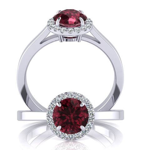 This stunning gemstone and halo diamond ring features one 6mm round shape garnet gemstone at 1.10 carats. It is surrounded by 18 sparkling diamonds in a halo in H-I color, I1-I2 clarity at 0.09 carats. Total gem weight is 1.19 carats. This ring is crafted in 14 karat white gold.