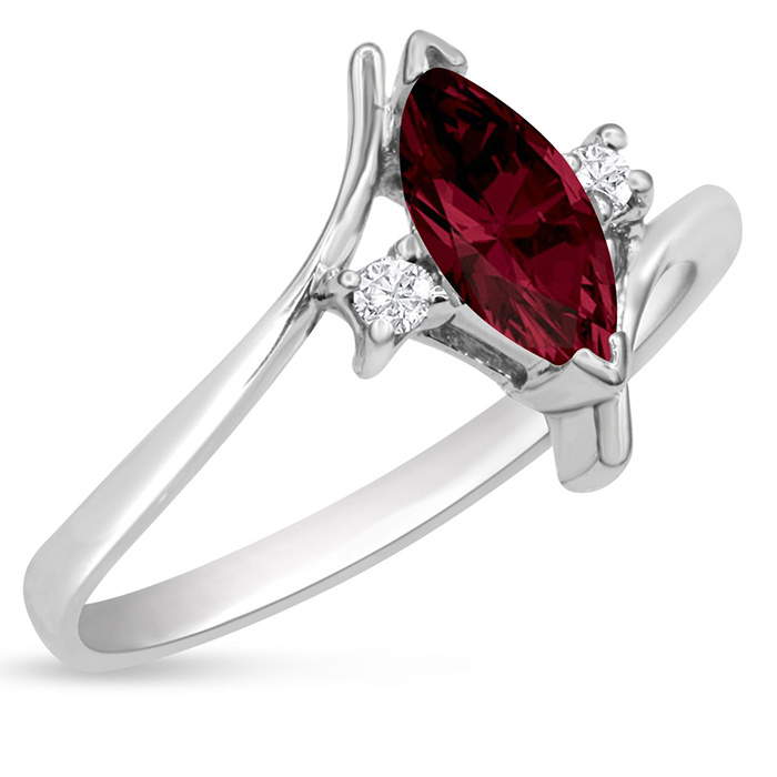 This garnet ring features one 8x4mm marquise shape garnet gemstone. It is surrounded by 2 sparkling diamonds totaling 0.05 carats in I-J color, I1-I2 clarity. Total carat weight is approximately 1/2 carat. This ring is in sterling silver.