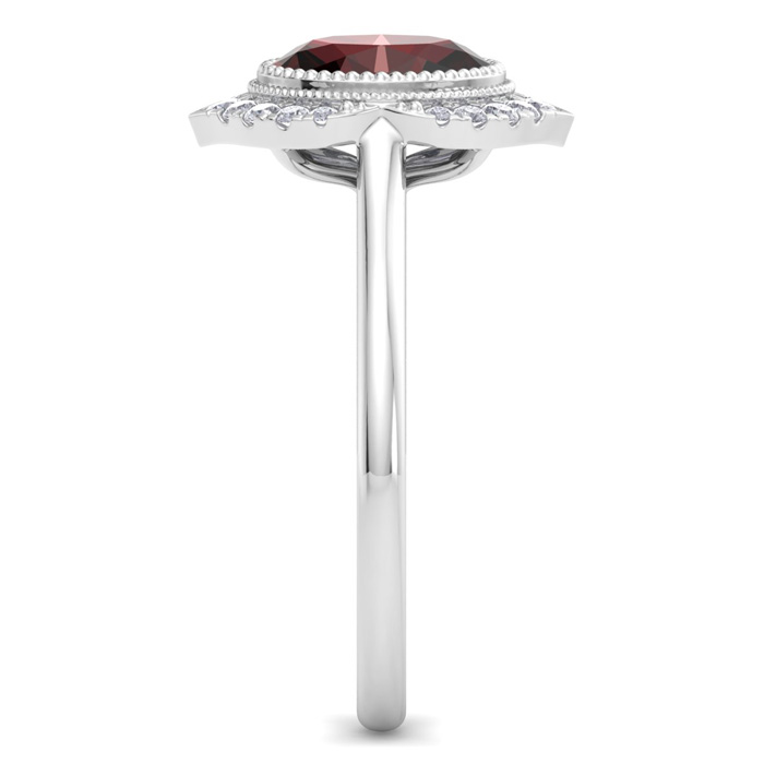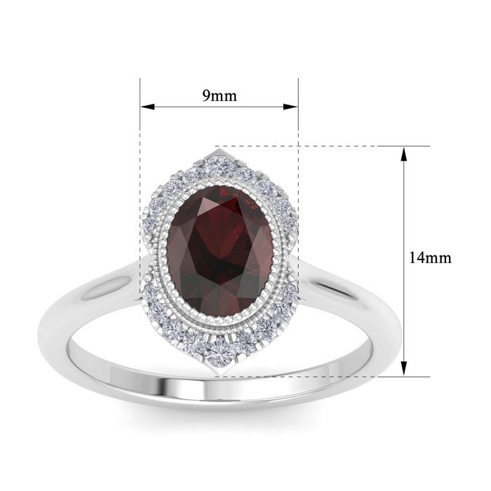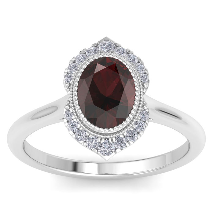 This gemstone ring features one 8x6mm oval shape garnet gemstone weighing approximately 1 1/5 carats. There are 18 sparkling diamonds in I-J color, I1-I2 clarity totaling approximately 1/5 carat. Total carat weight is 1 3/4 carats. This ring is in 14 karat white gold. *Retrograde Birthstones™ flips the idea of traditional birthstones. Wear your ½ birthday birthstone, your Retrograde Birthstone, “The Birthstone For Your Bad Side™.