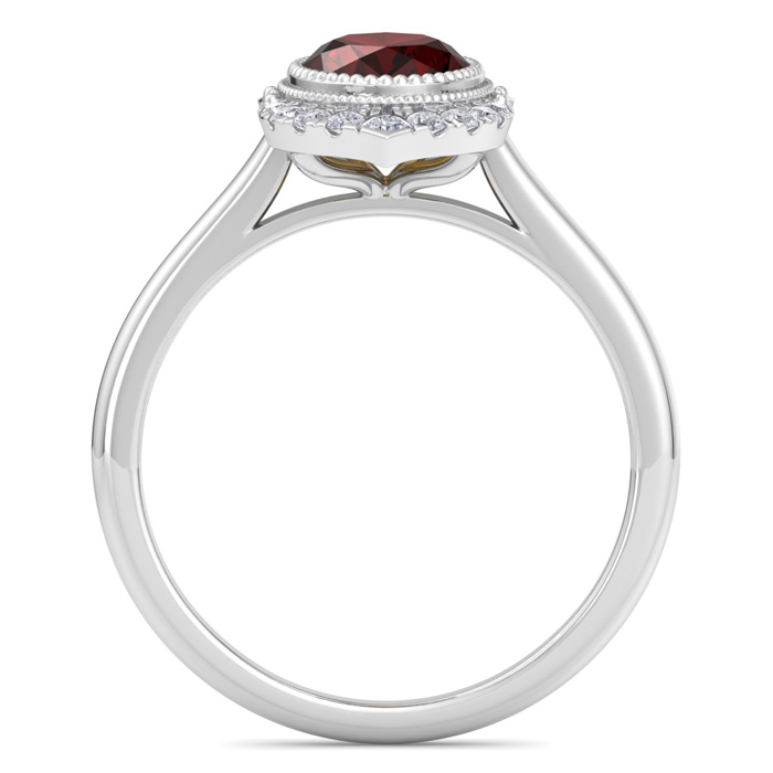 This gemstone ring features one 8x6mm oval shape garnet gemstone weighing approximately 1 1/5 carats. There are 18 sparkling diamonds in I-J color, I1-I2 clarity totaling approximately 1/5 carat. Total carat weight is 1 3/4 carats. This ring is in 14 karat white gold. *Retrograde Birthstones™ flips the idea of traditional birthstones. Wear your ½ birthday birthstone, your Retrograde Birthstone, “The Birthstone For Your Bad Side™.