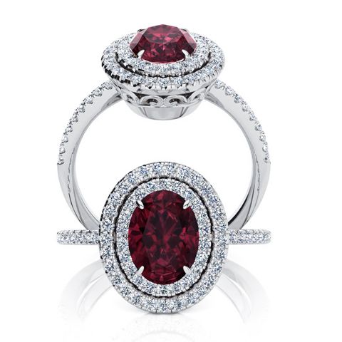 1 3/4 Carat Oval Shape Garnet and Double Halo Diamond Ring In 14 Karat White Gold