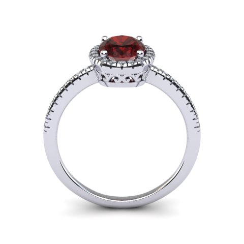 This stunning gemstone and halo diamond ring features one 8x6mm oval shape garnet gemstone at 1.50 carats. It is surrounded by 40 sparkling diamonds in a halo and down the band in I-J color, I1-I2 clarity at 0.20 carats. Total gem weight is 1.70 carats. This ring is crafted in 14 karat white gold.