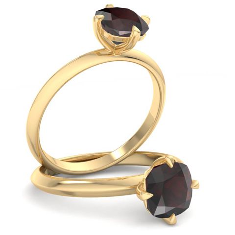 This gemstone ring features one 6mm cushion shape garnet gemstone weighing approximately 1 carat. This ring is in 14 karat yellow gold.