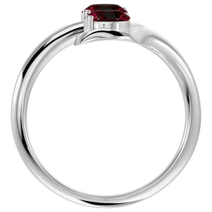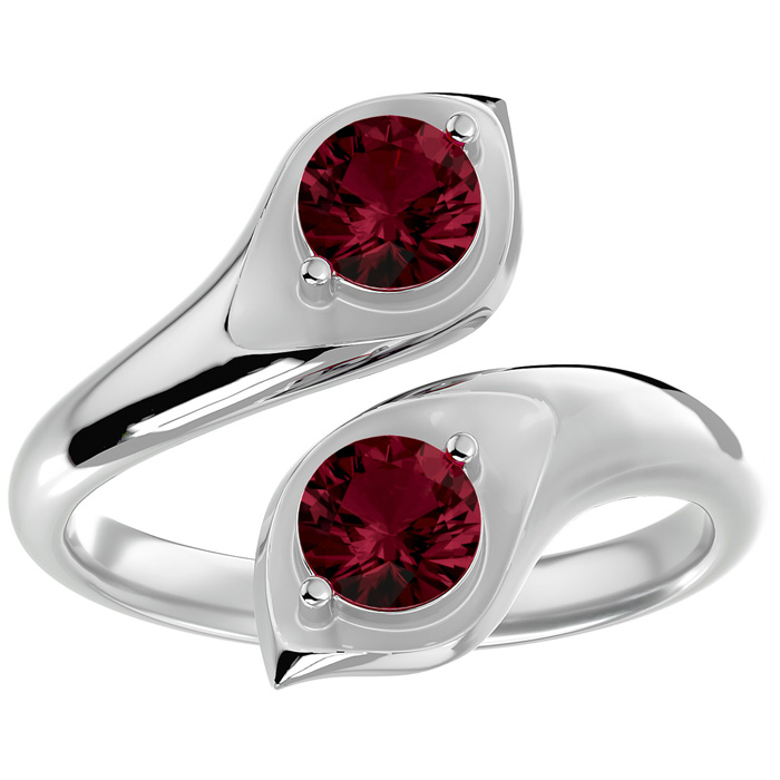 This elegant gemstone ring features two 5mm round shape garnet gemstones each weighing approximately 1/2 carat. Total carat weight is approximately 1 carat. This ring is in 14 karat white gold.