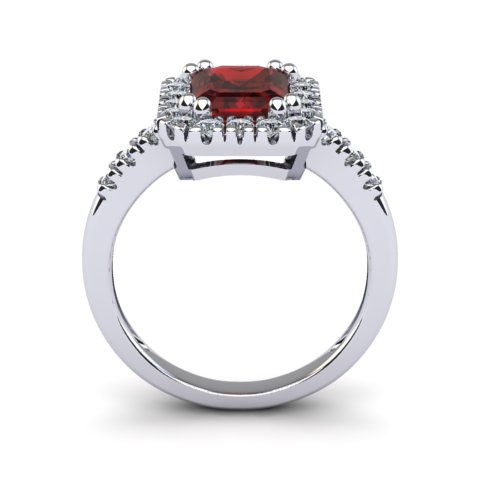 This stunning gemstone and diamond ring features one 8x6mm emerald cut garnet gemstone at 1.90 carats. It is surrounded by 24 sparkling diamonds in a halo and down the band in I-J color, I1-I2 clarity at 0.54 carats. Total gem weight is 2.44 carats. This ring is crafted in 14 karat white gold.