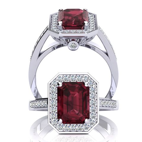 This stunning gemstone and halo diamond ring features one 8x6mm emerald shape garnet gemstone at 1.90 carats. It is surrounded by 38 sparkling diamonds in a halo and down the band in I-J color, SI2-I1 clarity at 0.39 carats. Total gem weight is 2.29 carats. This ring is crafted in 14 karat white gold.
