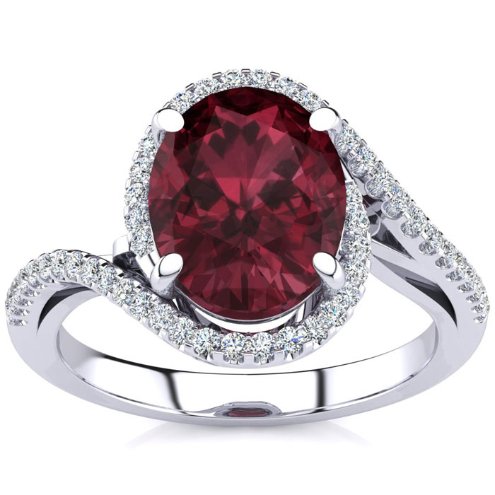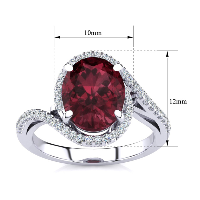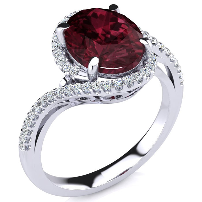 This garnet ring features one 10x8mm oval shape garnet gemstone. It is surrounded by 50 sparkling diamonds totaling 1/4 carat in I-J color, I1-I2 clarity. Total carat weight is approximately 2 3/4 carats. This ring is in sterling silver.