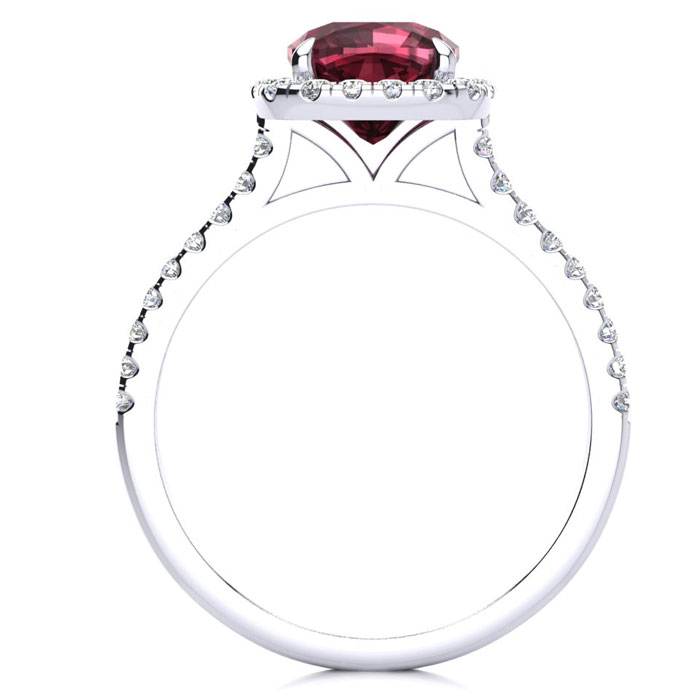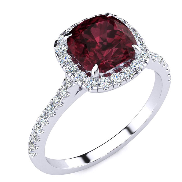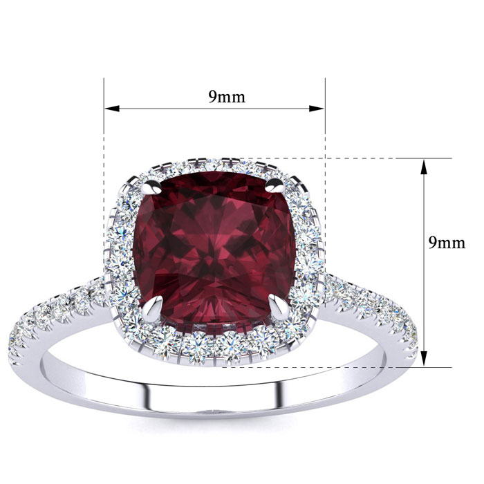 This garnet ring features one 7mm cushion cut garnet gemstone. It is surrounded by 38 sparkling diamonds totaling 1/2 carat in I-J color, I1-I2 clarity. Total carat weight is approximately 2 carats. This ring is in sterling silver.