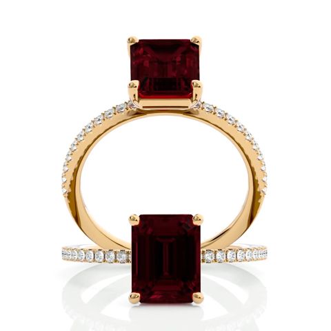 This stunning gemstone and diamond ring features one 8x6mm emerald shape garnet gemstone at 1.90 carats. It is surrounded by 22 sparkling diamonds along the band in I-J color, I1-I2 clarity at 0.18 carats. Total gem weight is 2.08 carats. This ring is crafted in 14 karat yellow gold.