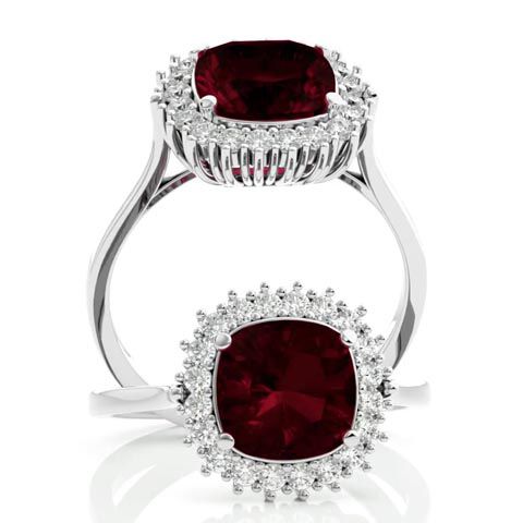 3 1/2 Carat Cushion Cut Garnet and Halo Diamond Ring In 14K White Gold