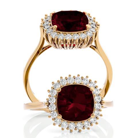 3 1/2 Carat Cushion Cut Garnet and Halo Diamond Ring In 14K Yellow Gold