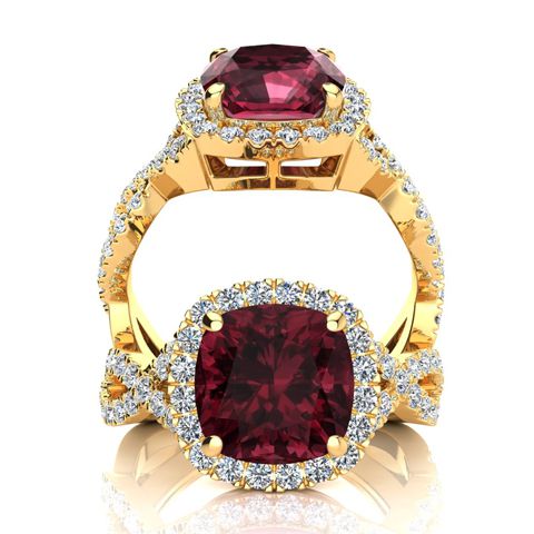 3 3/4 Carat Cushion Cut Garnet and Halo Diamond Ring With Fancy Band In 14 Karat Yellow Gold