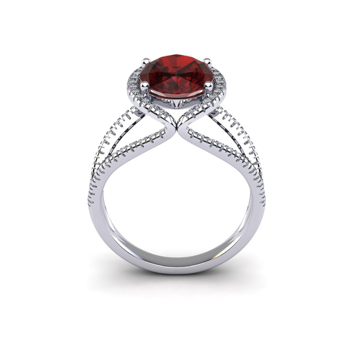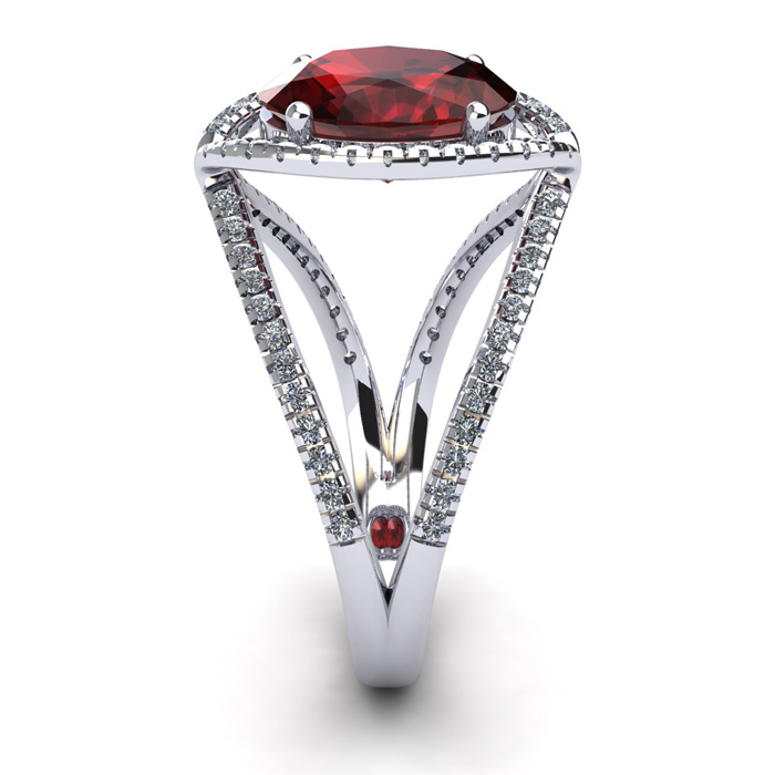 This stunning gemstone and diamond ring features one 10x8mm oval shape garnet gemstone at 3.10 carats. It is surrounded by 74 sparkling diamonds in a halo and down the split shank band in I-J color, I1-I2 clarity at 0.56 carats. Total gem weight is 3.66 carats. This ring is crafted in 14 karat white gold.