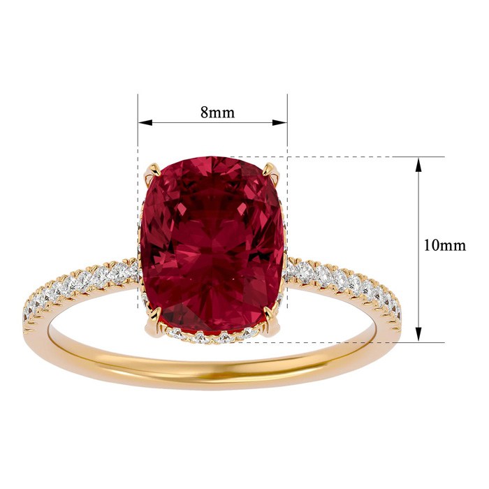 This elegant gemstone ring features one 10x8mm antique cushion shape garnet gemstone at approximately 3 1/2 carats. It is surrounded by 32 sparkling diamonds in I-J color, I1-I2 clarity at 1/4 carat total weight. Total gem weight is approximately 3 3/4 carats. This ring is in 14 karat yellow gold.