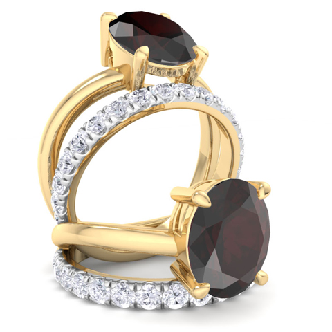 This elegant gemstone ring features one 10x8mm oval shape garnet gemstone at approximately 3 1/10 carats. It is surrounded by 18 sparkling diamonds in I-J color, I1-I2 clarity at 1/2 carat total weight. Total gem weight is approximately 3.60 carats. This ring is in 14 karat yellow gold.