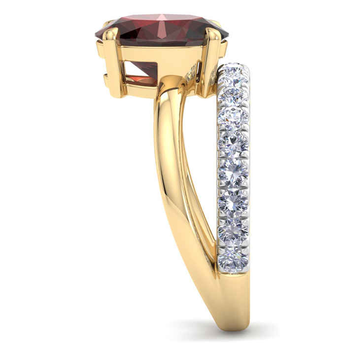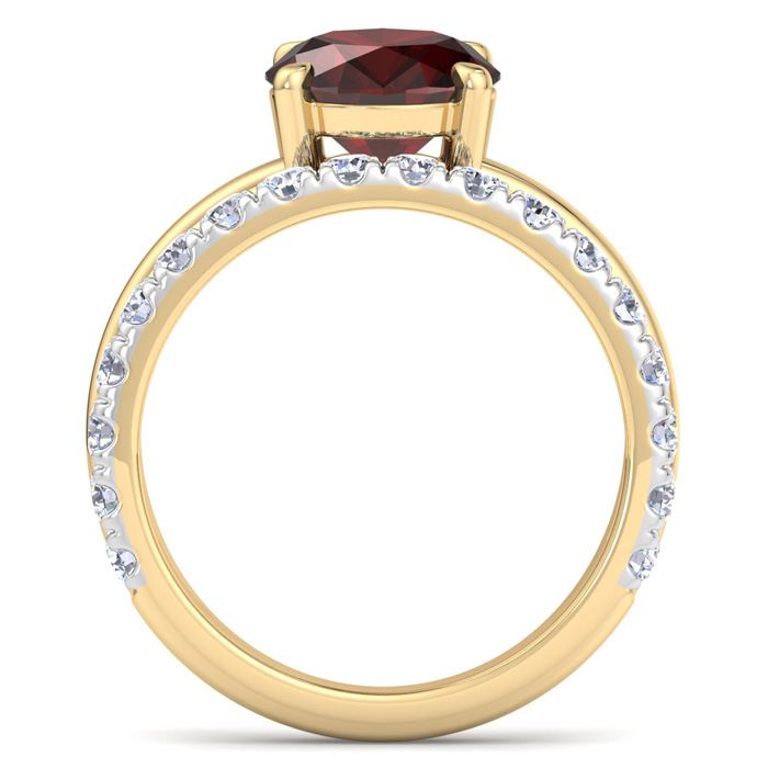 This elegant gemstone ring features one 10x8mm oval shape garnet gemstone at approximately 3 1/10 carats. It is surrounded by 18 sparkling diamonds in I-J color, I1-I2 clarity at 1/2 carat total weight. Total gem weight is approximately 3.60 carats. This ring is in 14 karat yellow gold.