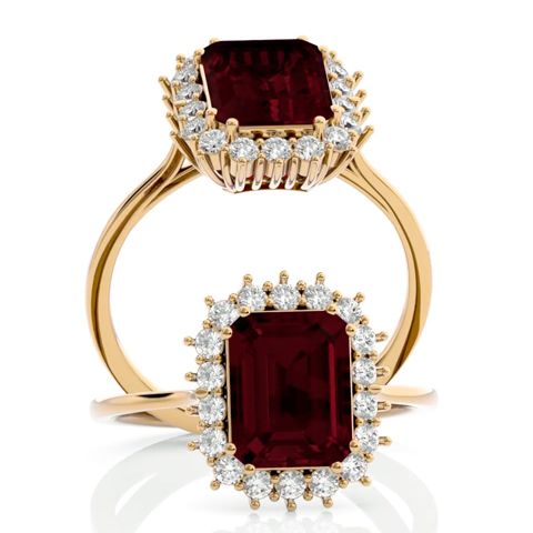This stunning gemstone and diamond ring features one 9x7mm emerald cut garnet gemstone at 2 3/4 carats. It is surrounded by 18 sparkling diamonds in I-J color, I1-I2 clarity at 1/3 carat. Total gem weight is approximately 3 carats. This ring is crafted in 14 karat yellow gold.