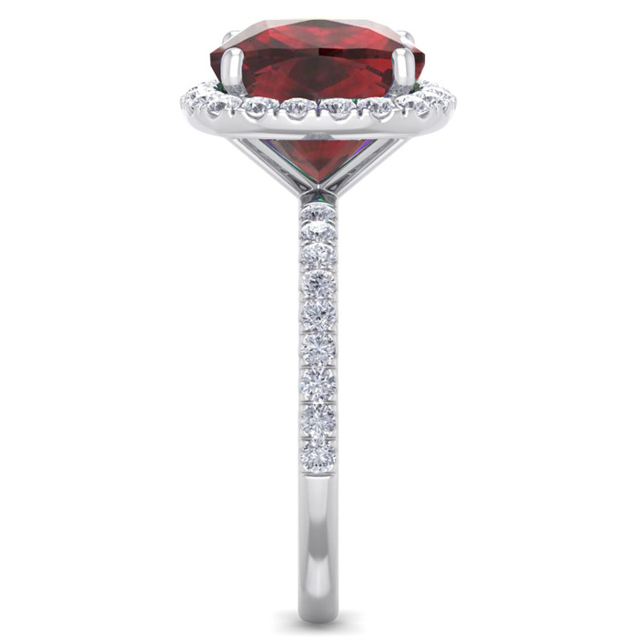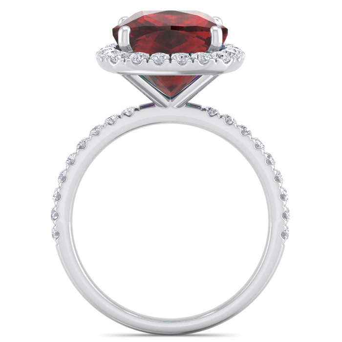 This garnet ring features one 10mm cushion cut garnet gemstone. It is surrounded by 38 sparkling diamonds totaling 1/2 carat in I-J color, I1-I2 clarity. Total carat weight is approximately 5 1/2 carats. This ring is in sterling silver.