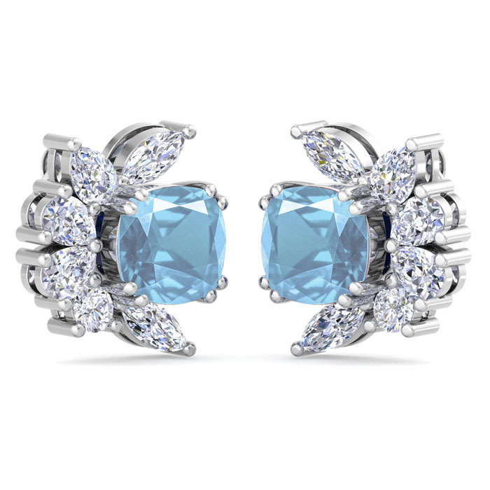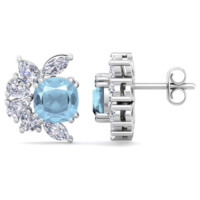 1 3/4 Carat Cushion Cut Aquamarine and Lab Grown Diamond Cluster Stud Earrings In 14 Karat White Gold