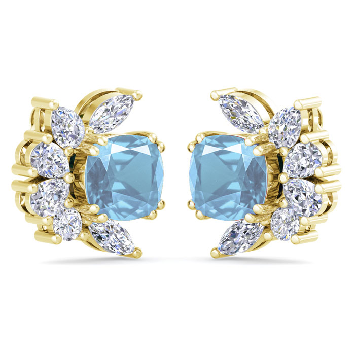 1 3/4 Carat Cushion Cut Aquamarine and Lab Grown Diamond Cluster Stud Earrings In 14 Karat Yellow Gold