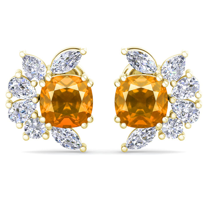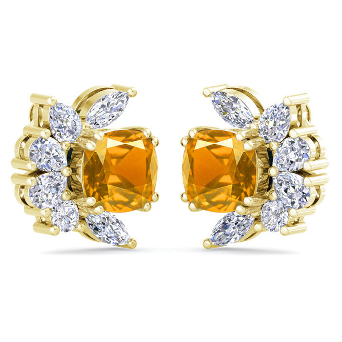 1 3/4 Carat Cushion Cut Citrine and Lab Grown Diamond Cluster Stud Earrings In 14 Karat Yellow Gold